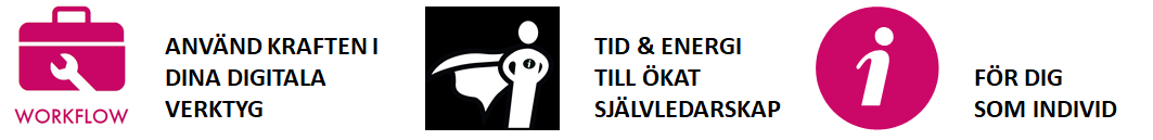 Med Workflow tar du ett stort första steg mot hållbar effektivitet. Du får träning i hur du kan använda dina befintliga IT-verktyg som din mailklient, din smarta telefon och framför allt din hjärna på ett mer effektivt sätt.